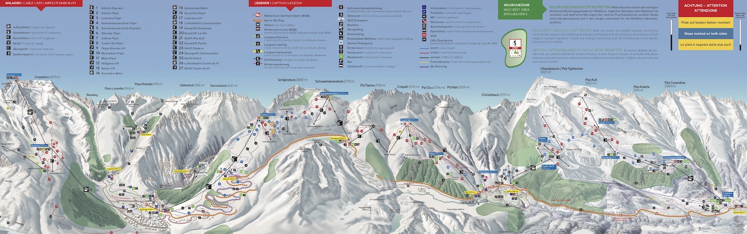 With 180 slopes and ski piste kilometres as well as 33 lifts, Andermatt, Sedrun and Disentis have grown together to form the largest ski resort in Central Switzerland, offering pistes for every requirement and skill level. The merge was completed with the brand-new aerial cableway, which hovers from the Sedrun station in six minutes up to the 2,203 m high mountain station Cuolm da Vi. From here skiers can enter the extensive network of pistes below Oberalpstock (3,327 m), Péz Ault (3,027 m) and Péz Acletta (2,922 m), which extends to Disentis.