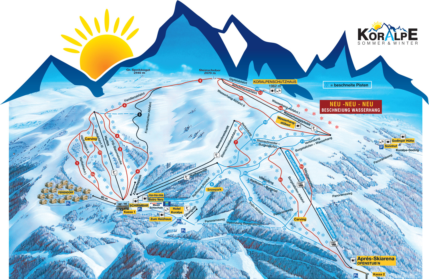 A training track for beginners or a 100 m wide piste for carving fans as well as a freeriding arena for pros and those who want to venture for a ride off – piste: at elevations from 1550 m to 2070 m Koralpe provides 28 km of perfectly prepared ski-runs offering all levels of difficulty - Koralpe provides ideal winter- fun for everyone.