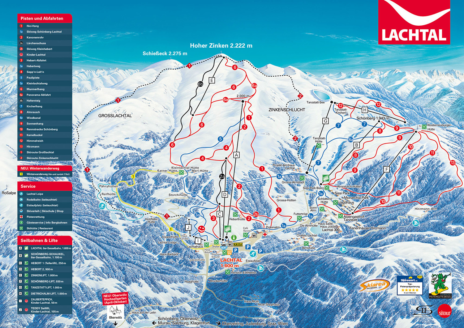 The resort of Lachtal provides 40 km/20 miles of slope and almost 10 miles of skiing tracks connecting the largest skiing regions of Styria. The region is well known for its excellent quality of slopes as well as for great kids` offers. Ample slopes, loads of deep powder snow, ideal trails for freeriders and marvelous runs for carvers-all these just at about 1 hour of drive from Graz and 2,5 from Vienna.